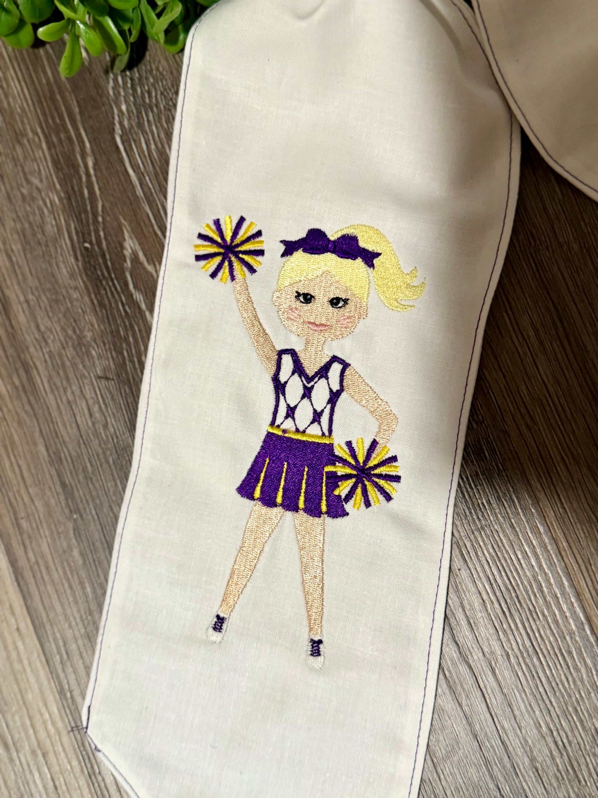 The customizable Cheerleader Wreath Sash offers a stylish and personalized way to display team pride. Featuring a decorative cheerleader design, this sash can be tailored with your team’s colors and mascot name for a unique, professional look. Made from high-quality materials.